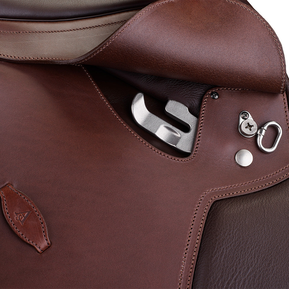 Eurooppalainen kulutuskestävä nahka satulan istuimessa ja siivissä, helppohoitoinen ja hygieeninen synteettinen materiaali hevosta vastan.